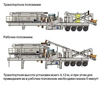 Одна мобильная установка (колесная или гусеничная) способна обслуживать несколько карьеров с объемом производства до 1 млн тонн в год. Беря их на вооружение, горно-добывающие предприятия избавляются от устаревшего стационарного и передвижного оборудования. Кроме того, использование мобильных установок позволяет уменьшить число операторов, необходимых для эксплуатации дробильно-сортировочного комплекса.